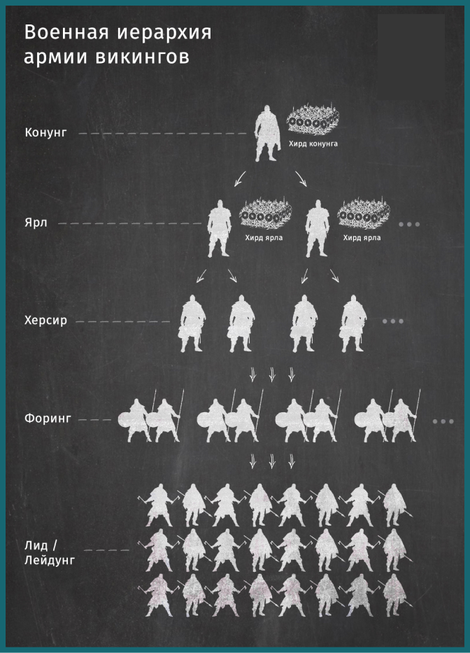 Полная иерархия армии древних скандинавов выглядела так: конунг > ярл > херсир > форинг > войско. Однако такая военная структура викингов отличалась в зависимостиnот её размеров и от того, было это формирование собрано для морского разбойничьего похода, полномасштабного завоевания, или это было войско для защиты от нападений. Давайте разберёмся.